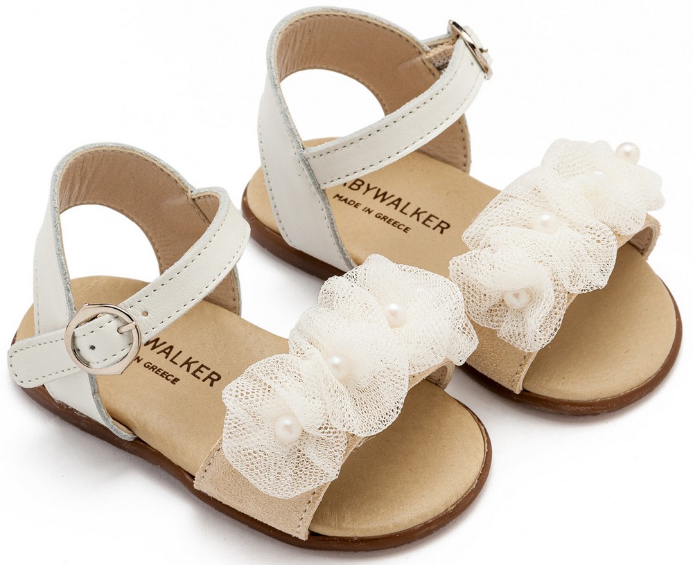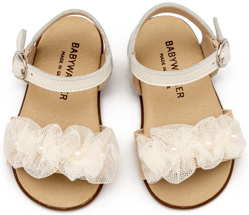 Δερμάτινο Πέδιλο Διακοσμημένο με Τούλινα Λουλουδάκια και Πέρλες από Δέρμα Πέρλα σε Εκρού Χρώμα