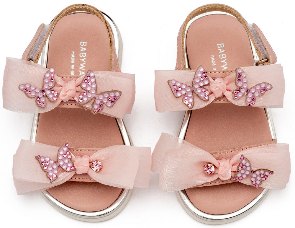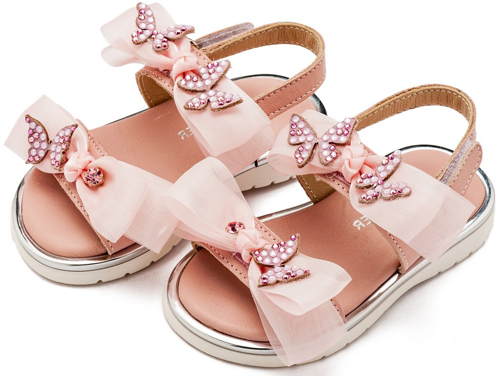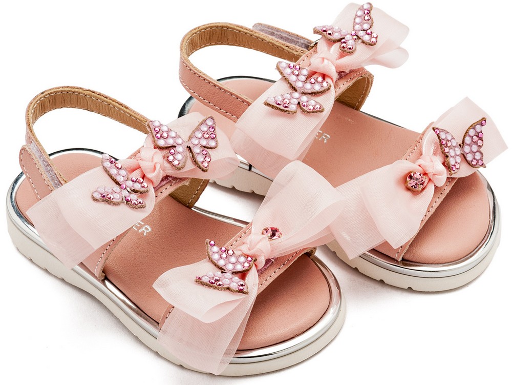 Δερμάτινο Πέδιλο με Φιόγκους Οργάντζας και Πεταλούδες Swarovski σε Ροζ Χρώμα
