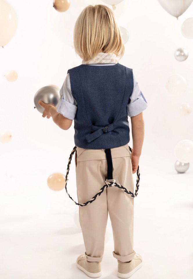 Ένα σύνολο που συνδυάζει αρμονικά τη φινέτσα με τη σύγχρονη κομψότητα! Το παντελόνι, από βαμβακερή καμπαρντίνα σε ανοιχτή μπεζ απόχρωση, ξεχωρίζει για το ιδιαίτερο κόψιμο στο πίσω μέρος, προσφέροντας μοναδική εφαρμογή και στυλ. Το γιλέκο, από blue cobalt cotton – λινό ύφασμα τύπου ψάθα, διαθέτει λοξό μονό ωμίτη, δημιουργώντας ένα διακριτικά ασύμμετρο design. Το βαμβακερό σιέλ πουκάμισο oxford με τον ξεχωριστό Mao γιακά προσδίδει ένα σύγχρονο twist στο κλασικό ύφος. Ολοκληρώνοντας το look, το personalized βουάλ φουλάρι με γεωμετρικά σχέδια, οι δίχρωμες τιράντες και το ψάθινο καπέλο (ή τραγιάσκα κατά επιλογή) συνθέτουν ένα απόλυτα ισορροπημένο και στιλάτο αποτέλεσμα.