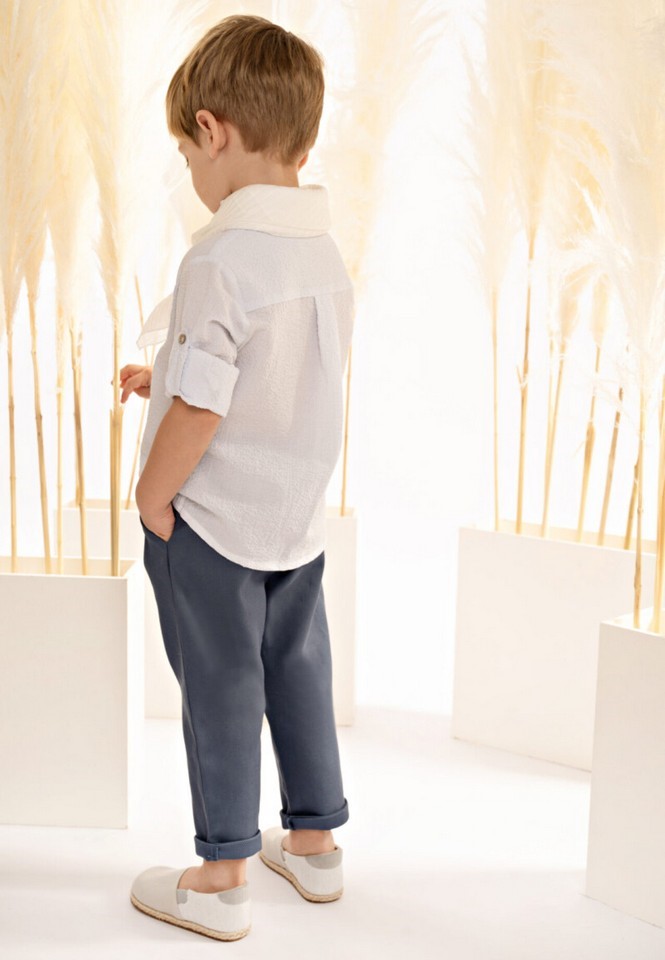 Ένα μοντέρνο και ανεπιτήδευτα κομψό unformal σύνολο. Το baggy παντελόνι σε cobalt blue απόχρωση, κατασκευασμένο από βαμβακερό καμβά, χαρίζει χαλαρή εφαρμογή και σύγχρονη αισθητική. Το πουκάμισο, φτιαγμένο από γκοφρέ micro striped ύφασμα σε σιέλ απόχρωση, ξεχωρίζει για τον ιδιαίτερο Mao γιακά, το εξωτερικό τσεπάκι και την πιέτα στο πίσω μέρος. Η τελική πινελιά έρχεται με το υπέροχο πλισέ φουλάρι σε off white χρώμα, ενώ το ψάθινο καπέλο ή η τραγιάσκα προσθέτουν τη σωστή δόση ρετρό κομψότητας στο look.