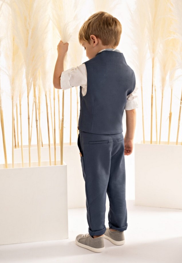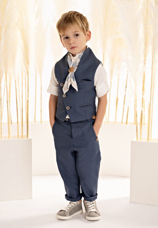 Ένα σύνολο με άψογη αισθητική, ιδανικό για μικρούς τζέντλεμεν! Σε αποχρώσεις του cobalt blue, το βαμβακερό καμβαδένιο παντελόνι διαθέτει ιδιαίτερη λεπτομέρεια στο ζωνάκι, ενώ το γιλέκο, με το λοξό κούμπωμα και τις τσέπες φιλέτο, προσδίδει σύγχρονη κομψότητα. Το βαμβακερό πουκάμισο σε off white απόχρωση ξεχωρίζει με τον ιδιαίτερο Mao γιακά του, προσφέροντας ένα σύγχρονο twist στο κλασικό ύφος. Το personalized βουάλ φουλάρι με γεωμετρικά μοτίβα σε σιέλ και μπεζ τόνους προσθέτει μια παιχνιδιάρικη πινελιά, ενώ η επιλογή ανάμεσα σε ψάθινο καπέλο ή κομψή τραγιάσκα ολοκληρώνει το look με στιλ και φινέτσα.