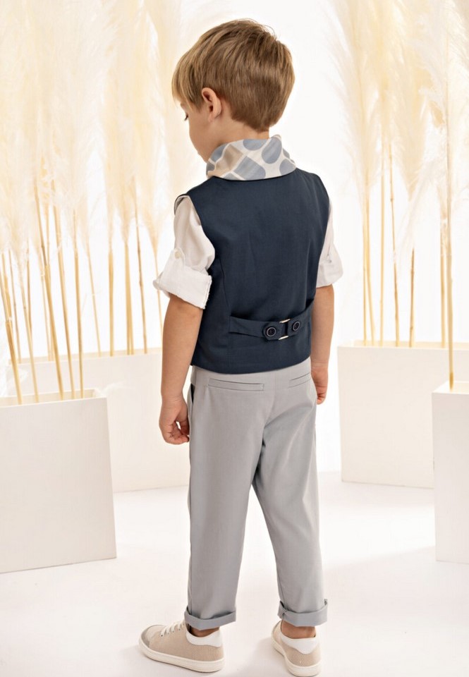 Ένα σύνολο που ισορροπεί τέλεια ανάμεσα στην κλασική φινέτσα και τη μοντέρνα αισθητική. Το δίπιετο παντελόνι, με τη διπλή λοξή ζώνη, από μαλακό βαμβακερό ύφασμα σε crystal grey απόχρωση, χαρίζει άνεση και στυλ, ενώ το γιλέκο, με το κλασικό του κόψιμο, από βαμβακερή καμπαρντίνα σε cobalt blue χρώμα, προσθέτει μια διαχρονική πινελιά. Το off white βαμβακερό πουκάμισο, με τον ιδιαίτερο Mao γιακά, ολοκληρώνει το σύνολο με έναν αέρα κομψότητας. Οι λεπτομέρειες κάνουν τη διαφορά, με το personalized βουάλ φουλάρι με γεωμετρικά μοτίβα σε σιέλ-μπεζ αποχρώσεις και το ψάθινο καπέλο (ή τραγιάσκα κατά επιλογή) να δίνουν την απόλυτη αρμονία σε αυτό το εκλεπτυσμένο look.