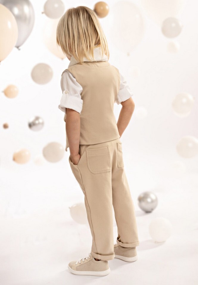 Ένα υπέροχο σύνολο που αποπνέει αίσθηση χαλαρής κομψότητας με ένα μοντέρνο και ευχάριστο twist. Το παντελόνι baggy σε μπεζ βαμβακερό jersey ύφασμα, με λοξό κούμπωμα και εξωτερικές πίσω τσέπες, συνδυάζεται άψογα με το γιλέκο με ασύμμετρο λοξό κόψιμο και εξωτερικό τσεπάκι, προσφέροντας μια μοντέρνα αίσθηση. Το βαμβακερό πουκάμισο σε off white απόχρωση με τον ιδιαίτερο Μao γιακά αναδεικνύει την απλότητα και τη φινέτσα του συνόλου, ενώ το φουλάρι σε off white από υφαντή γάζα προσθέτει μια ανάλαφρη αίσθηση. Η ζώνη από μπεζ κορδόνι και το ψάθινο καπέλο ή τραγιάσκα (κατά επιλογή) ολοκληρώνουν το look, προσφέροντας την τέλεια ισορροπία κομψότητας και άνεσης.