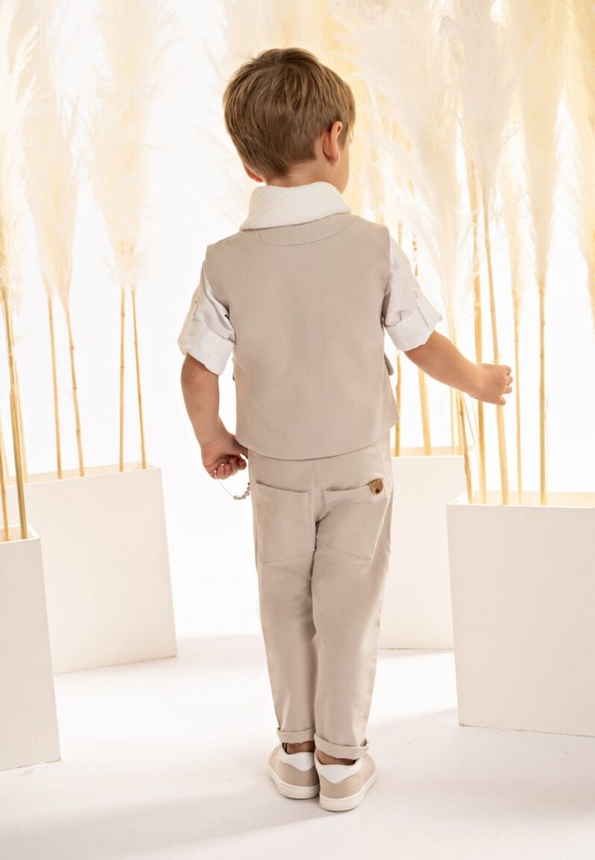 Αίσθηση κομψότητας με μοντέρνα στοιχεία που το καθιστούν εξαιρετικά όμορφο και σύγχρονο, αυτό το σύνολο αποτελείται απο: παντελόνι σε μπεζ ανοιχτό χρώμα, με ιδιαίτερα κοψίματα στο πλάι και εξωτερικές πίσω τσέπες από diagonal cotton-viscose ύφασμα και γιλέκο με λοξό ασύμμετρο κόψιμο και εξωτερικό τσεπάκι σε μπεζ γκοφρέ βαμβακερό ύφασμα. Το βαμβακερό πουκάμισο σε off white απόχρωση με Mao ιδιαίτερο γιακά δένει αρμονικά με το υπόλοιπο σύνολο, προσθέτοντας μια λεπτομέρεια που κάνει την διαφορά. Το φουλάρι από υφαντή γάζα και η ζώνη από λευκό κορδόνι ολοκληρώνουν ιδανικά το σύνολο, ενώ το ψάθινο καπέλο ή η τραγιάσκα (κατά επιλογή) προσφέρουν την τελευταία πινελιά στον αέρα. Ένα σύνολο που ισορροπεί τέλεια ανάμεσα στην άνεση και την κομψότητα!