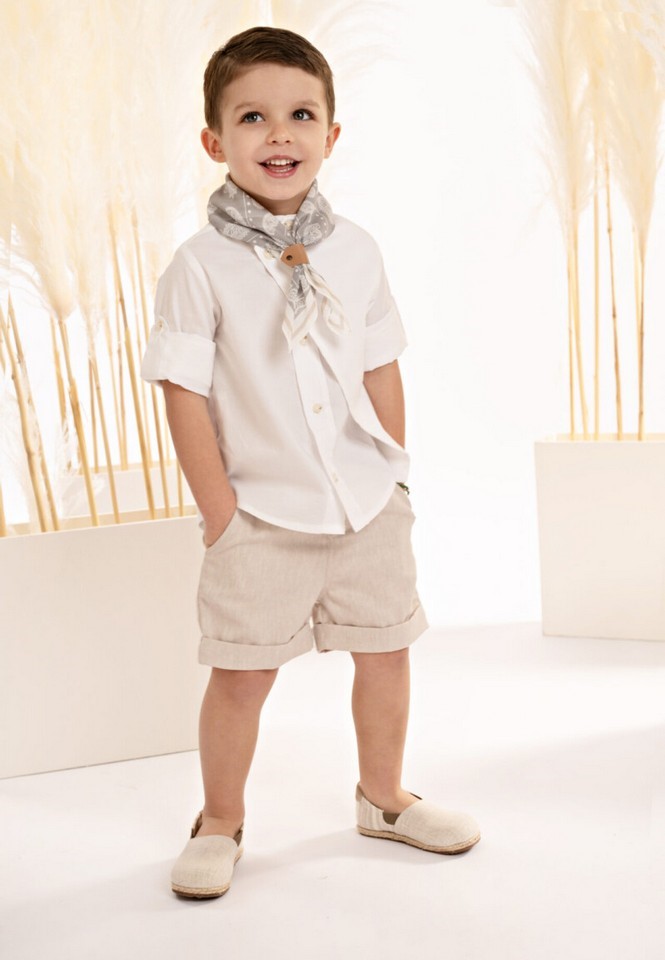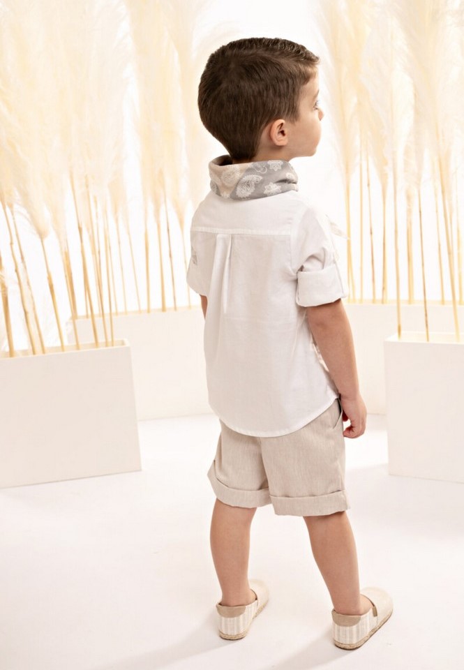 Ένα υπέροχο σύνολο που συνδυάζει άνεση και casual κομψότητα. Η βερμούδα σε loose γραμμή από μπεζ μελανζέ τεχνικό ύφασμα και το βαμβακερό πουκάμισο με mao γιακά και λοξό διπλό κούμπωμα δημιουργούν έναν τέλειο συνδυασμό. Το personalized βουάλ φουλάρι με τα λαχούρια σε μπεζ-γκρι απόχρωση προσφέρει μια ανεπιτήδευτη αίσθηση στυλ, ενώ το ψάθινο καπέλο ή τραγιάσκα (ανάλογα με την προτίμηση) ολοκληρώνει το σύνολο με την απόλυτη καλοκαιρινή διάθεση