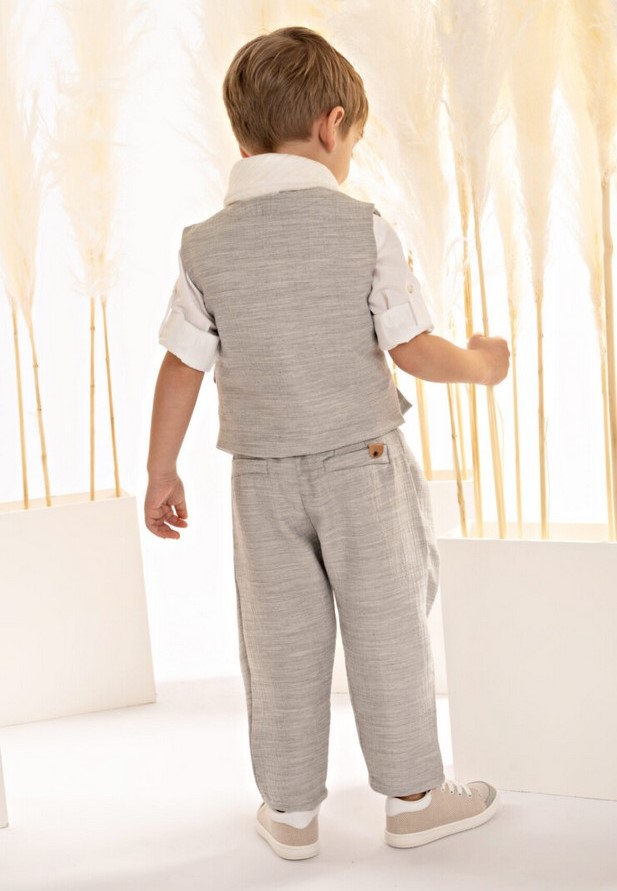 Μια κομψή και μοντέρνα πρόταση που ισορροπεί ανάμεσα στην κλασική γραμμή και τις σύγχρονες λεπτομέρειες. Το σύνολο περιλαμβάνει παντελόνι σε silver grey μελανζέ γκοφρέ ύφασμα, με ιδιαίτερες reverse πιέτες, συνδυασμένο με γιλέκο που διαθέτει λοξό ασύμμετρο κόψιμο και εξωτερικό τσεπάκι. Το βαμβακερό πουκάμισο σε off white απόχρωση με τον ξεχωριστό mao γιακά ολοκληρώνει την εμφάνιση, ενώ το πλισέ φουλάρι σε off white χρώμα, η ζώνη από γκρι μελανζέ κορδόνι και το ψάθινο καπέλο ή τραγιάσκα (ανάλογα με την προτίμηση) προσθέτουν τις τελευταίες πινελιές κομψότητας.