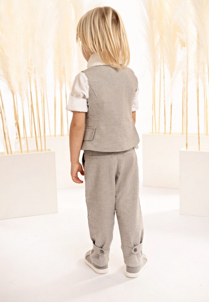 Ένα εκλεπτυσμένο σετ σε γκρι μελανζέ απόχρωση, από cotton-lino ύφασμα, που συνδυάζει κομψότητα και μοναδικές λεπτομέρειες. Το παντελόνι, σε ίσια γραμμή, σφίγγει στο κάτω μέρος με θυλάκι, ενώ το σταυρωτό γιλέκο, μεπατάκια τσέπες και ασύμμετρο τελείωμα, προσθέτει δυναμισμό στο σύνολο. Το βαμβακερό πουκάμισο σε off white απόχρωση, με τον ξεχωριστό Μao γιακά, συνδυάζεται ιδανικά με το πλισέ φουλάρι στην ίδια απόχρωση, τη ζώνη από υφαντό ιμάντα και το ψάθινο καπέλο ή τραγιάσκα (ανάλογα με την προτίμηση), ολοκληρώνοντας ένα σύνολο που ισορροπεί ανάμεσα στο σύγχρονο και το διαχρονικό.