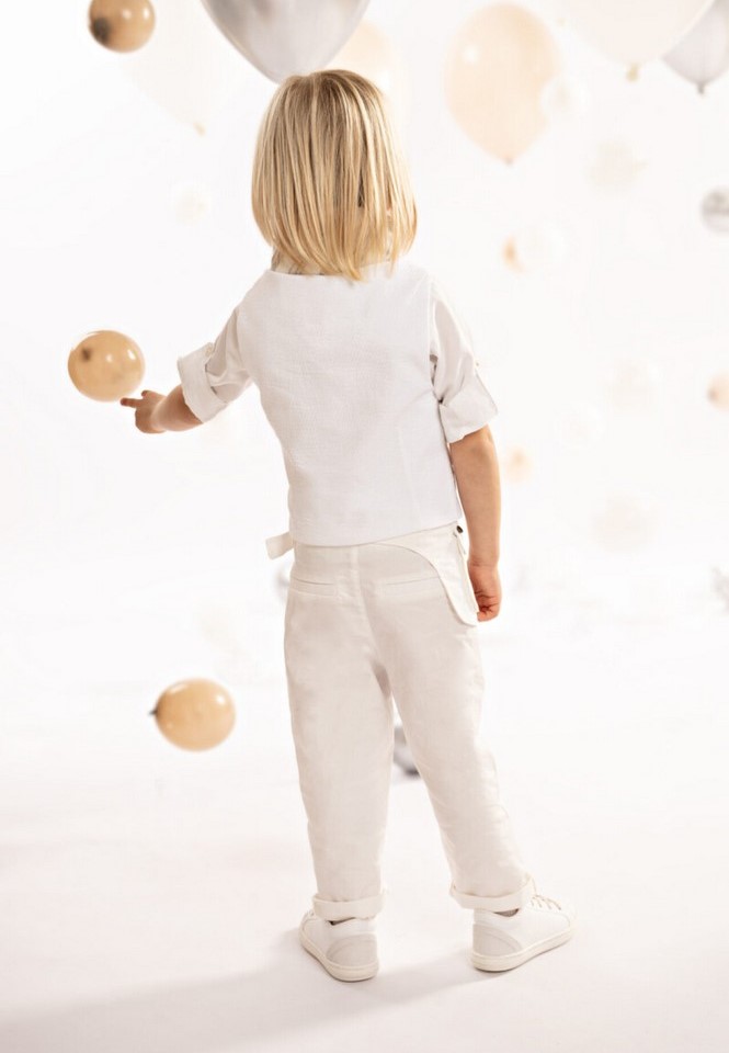 Ένα σετ με μοναδική αίσθηση στυλ και φινέτσας, με το ιδιαίτερο λευκό παντελόνι σε ίσια γραμμή, που συνοδεύεται από έξτρα αξεσουάρ ζώνη με εξωτερική cargo τσέπη από βαμβακερή καμπαρντίνα. Το γιλέκο με λοξό κούμπωμα και διπλά φιλέτα τσέπες, φτιαγμένο από λευκό βαμβακερό γκοφρέ ύφασμα, ενισχύει την ιδιαιτερότητα του συνόλου. Το βαμβακερό πουκάμισο σε off white απόχρωση με ιδιαίτερο Μao γιακά ,συνδυάζεται άψογα με το υφαντό ριγέ φουλάρι σε off white-μπεζ χρώμα και το ψάθινο καπέλο (ή τραγιάσκα κατά επιλογή) δίνοντας μια άκρως καλοκαιρινή αίσθηση.