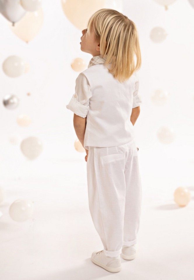 Ένα εξαιρετικό σύνολο από tencel-lino-cotton ύφασμα σε off white αποχρώσεις, το οποίο συνδυάζει το παντελόνι με τις ιδιαίτερες reverse πιέτες και το γιλέκο με ασύμμετρο κόψιμο και εξωτερικό τσεπάκι. Το βαμβακερό πουκάμισο σε off white απόχρωση ξεχωρίζει με τον ιδιαίτερο Μao γιακά. Το σύνολο ολοκληρώνεται ιδανικά με το personalized βουάλ φουλάρι με τα γεωμετρικά σχέδια σε μπεζ-λευκούς χρωματισμούς, την ζώνη από λευκό κορδόνι και το ψάθινο καπέλο (ή τραγιάσκα κατά επιλογή), προσφέροντας μια φυσική αίσθηση φρεσκάδας και μοντέρνας κομψότητας.