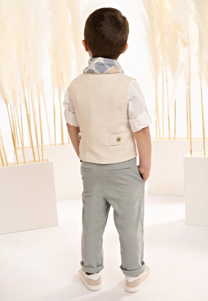 Ένα σύνολο γεμάτο φρεσκάδα με υπέροχο συνδυασμό χρωμάτων και υφών το οποίο αποτελείται από, παντελόνι με ιδιαίτερη λεπτομέρεια στο ζωνάκι από λινό σε mint χρώμα και γιλέκο σε κλασσική γραμμή με έξυπνα κοψίματα, φτιαγμένο από υπέροχο υφαντό ιταλικό ύφασμα σε εκρού απόχρωση. Το βαμβακερό πουκάμισο σε off white απόχρωση έχει έναν πολύ ιδιαίτερο Μao γιακά, ενώ το σύνολο ολοκληρώνεται άψογα με το personalized βουάλ φουλάρι με γεωμετρικά σχέδια σε μπεζ-σιέλ απόχρωση και το ψάθινο καπέλο (ή τραγιάσκα κατά επιλογή).