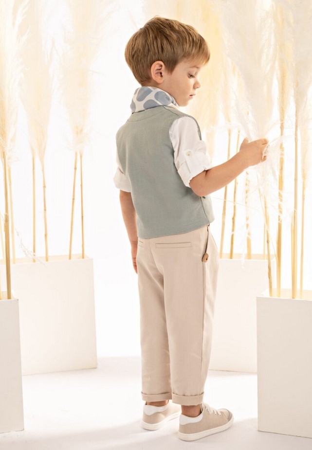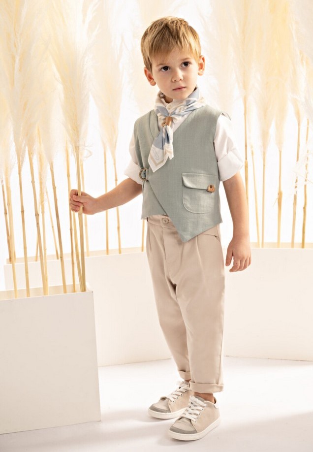 Ένα φωτεινό και μοντέρνο σύνολο αποτελούμενο από παντελόνι δίπιετο με έξτρα λοξή ζώνη από μπεζ βαμβακερή καμπαρντίνα και γιλέκο με ασύμμετρο κόψιμο, εξωτερικό τσεπάκι και λινό ύφασμα σε mint χρώμα. Το βαμβακερό πουκάμισο σε off white απόχρωση διαθέτει έναν πολύ ιδιαίτερο Μao γιακά, ενώ το σύνολο ολοκληρώνεται με το personalized βουάλ φουλάρι με γεωμετρικά σχέδια σε μπεζ-σιέλ αποχρώσεις και το ψάθινο καπέλο (ή τραγιάσκα κατά επιλογή), προσφέροντας μια διακριτική και κομψή αίσθηση.
