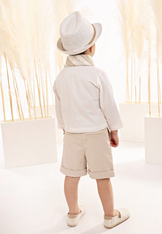 Ένα μοντέρνο σύνολο που συνδυάζει άνεση και κομψότητα, αποτελείται από βερμούδα σε loose γραμμή από μπεζ βαμβακερή καμπαρντίνα και 100% λινή τουνίκ που κλείνει μπροστά με πατιλέτα, προσφέροντας μια αέρινη και κομψή αίσθηση. Το σύνολο ολοκληρώνεται άψογα με το υφαντό ριγέ φουλάρι σε off white-μπεζ απόχρωση και το ψάθινο καπέλο (ή τραγιάσκα κατά επιλογή)., προσδίδοντας μια χαλαρή αλλά ταυτόχρονα στιλάτη εμφάνιση.