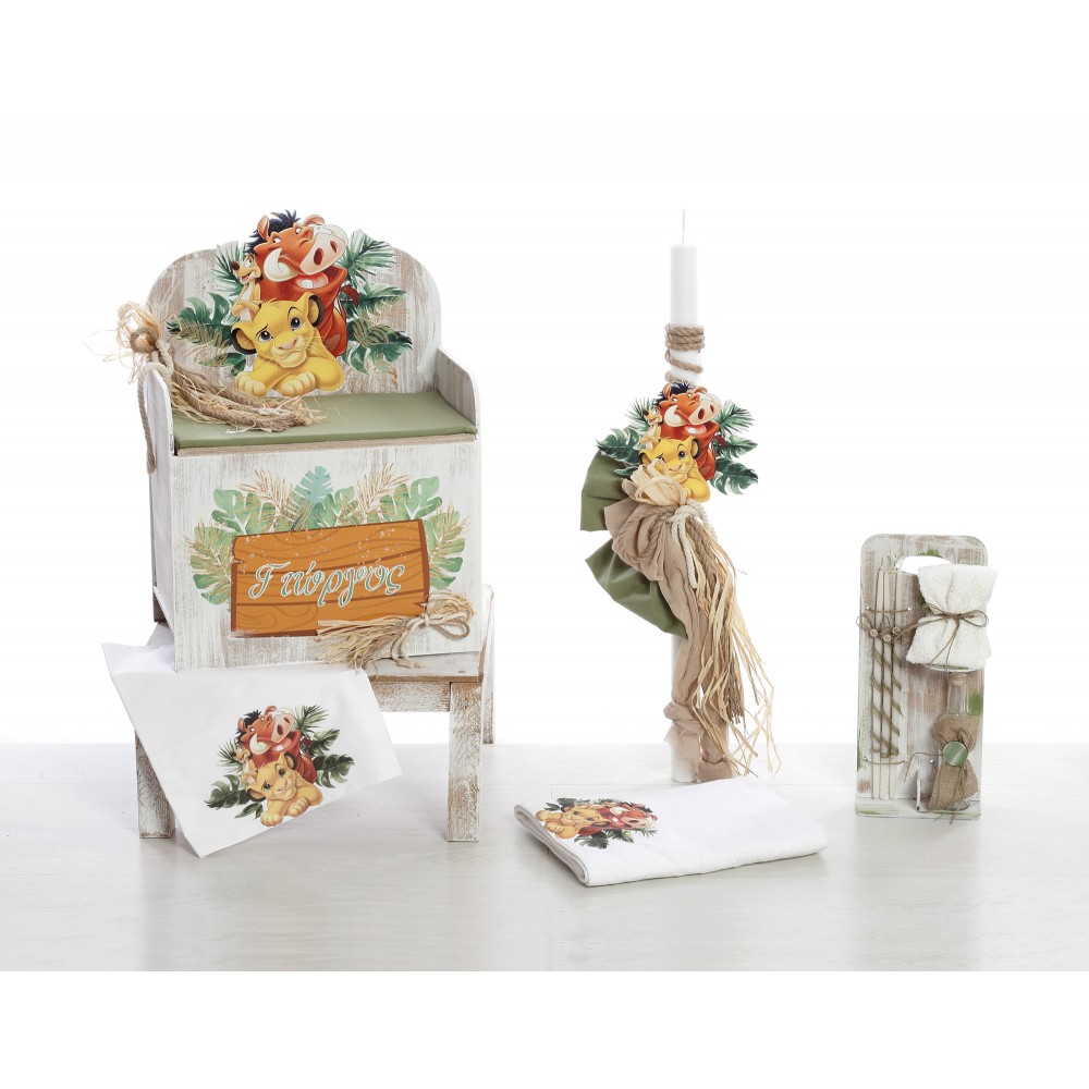 Ολοκληρωμένο βαπτιστικό σετ με αγαπημένο θέμα Lion King, διακοσμημένο με υψηλής ποιότητας UV εκτύπωση σε τροπικό στυλ. Ζωντανά χρώματα και χαρούμενα σχέδια ιδανικά για μια ξεχωριστή βάπτιση.