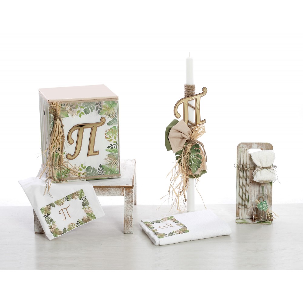 Ολοκληρωμένο βαπτιστικό σετ με μοντέρνο και minimal στυλ, διακοσμημένο με χρυσό μονόγραμμα από plexiglass, σε συνδυασμό με tropical στοιχεία και φυσικά υλικά. Ιδανική επιλογή για μια ξεχωριστή και κομψή βάπτιση.