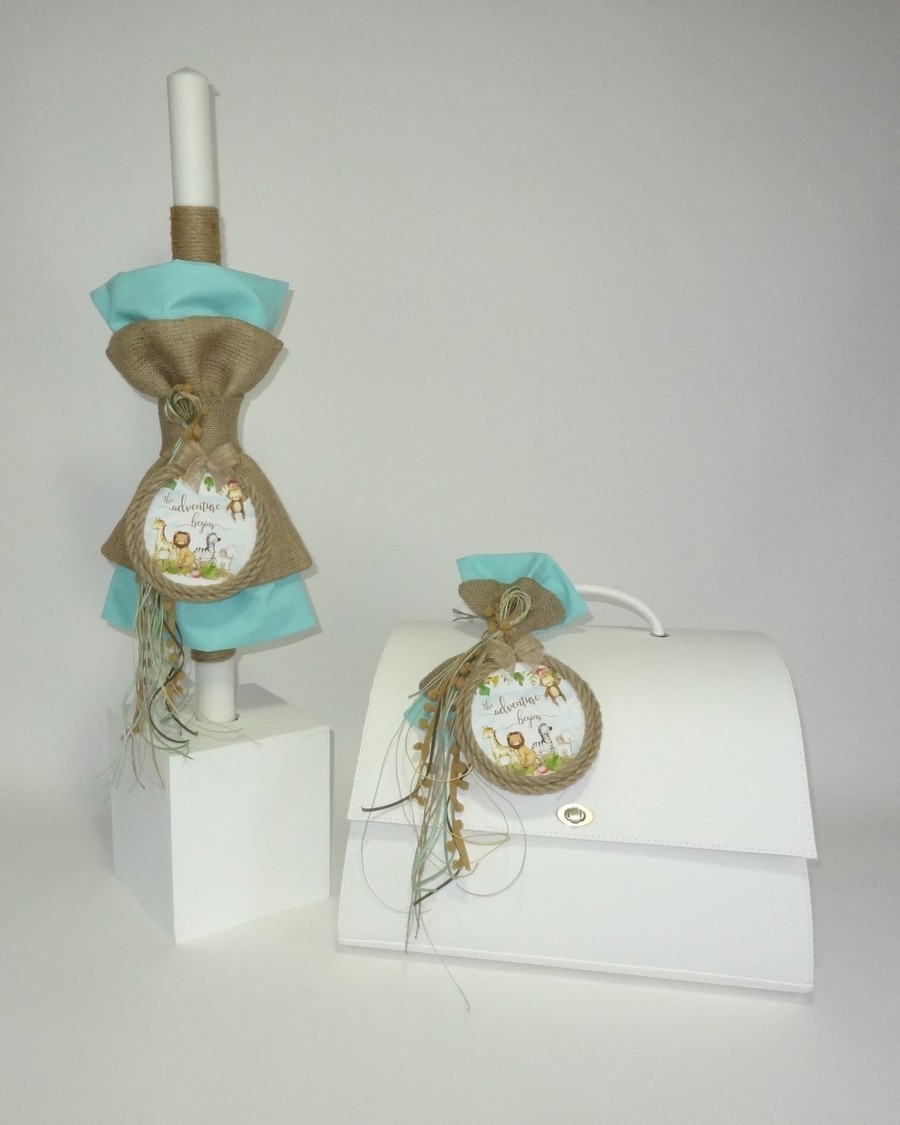Βαπτιστικό σετ περιλαμβάνει (Λαμπάδα, Κουτί ή Βαλίτσα, τρία κεράκια, λαδοσετ με μπουκαλάκι για το λάδι και σαπουνάκι)