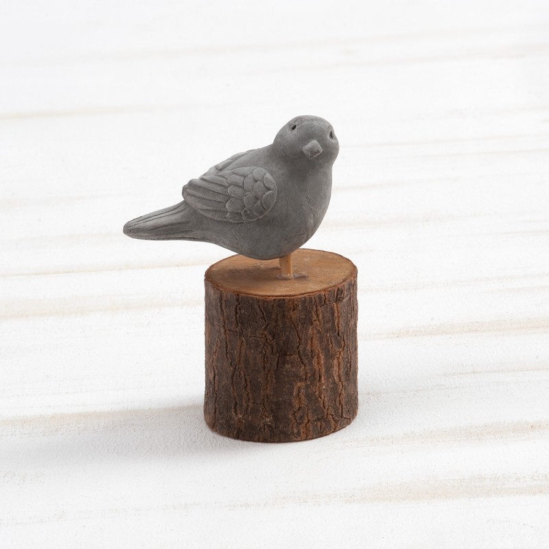 Τσιμεντένιο διακοσμητικό πουλάκι πάνω σε κορμό δέντρου.