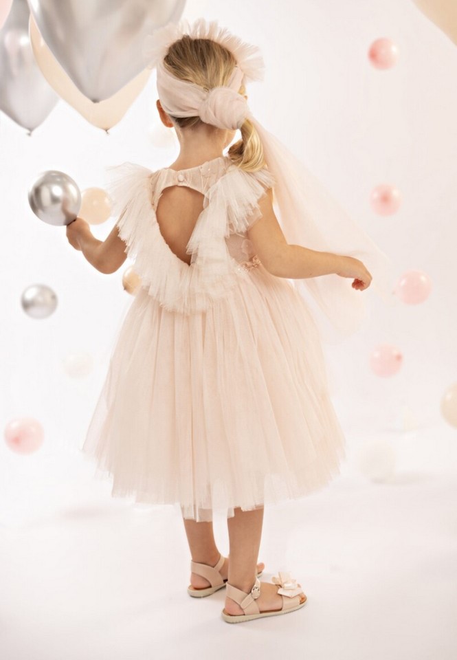 ολοκληρώνεται με κορδέλα μαλλιών διακοσμημένη με πλούσιο τούλινο βολάν. Όλα τα
