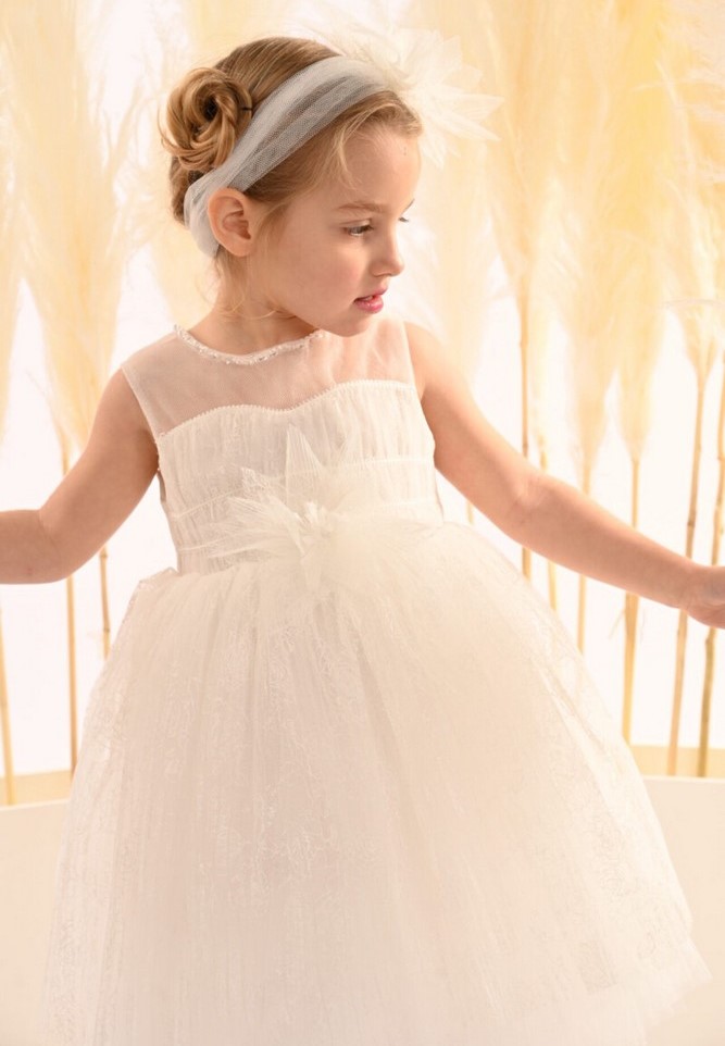 Ένα μοναδικά ραφινάτο φόρεμα σε off white απόχρωση, φτιαγμένο από υπέροχο πλισέ τούλι διακοσμημένο με τυπωμένα τριαντάφυλλα, που μοιάζουν να έχουν ζωγραφιστεί στο ύφασμα. Το ντραπέ μπούστο, σε σχήμα καρδιάς, αγκαλιάζει κομψά το σώμα, ενώ η δαντελένια μίνι τρέσα χαρίζει μια διακριτική πινελιά. Η φούστα, πλούσια και αέρινη, επιτρέπει στο φουρό να ξεπροβάλλει διακριτικά από κάτω, προσθέτοντας όγκο και κίνηση στο σύνολο. Το φόρεμα στολίζει ένα μοναδικό, χειροποίητο λουλούδι, που δίνει μια ξεχωριστή νότα, ενώ το ίδιο κόσμιε και την κομψή κορδέλα για τα μαλλιά.