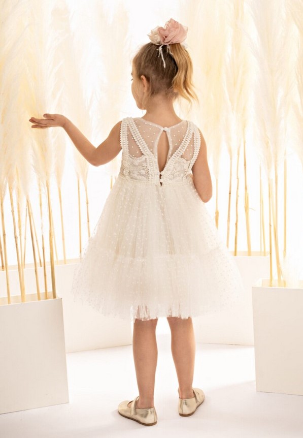 Ένα πανέμορφο φόρεμα σε εκρού χρώμα, φτιαγμένο από λεπτό πουά κεντημένο τούλι που αποπνέει μια αίσθηση ρετρό κομψότητας. Το μπούστο από πουά τούλι, έχει γαλλική δαντέλα σε σχήμα καρδίας στο στήθος και ντουμπλάρισμα από ύφασμα με διάφανες παγιέτες για διακριτική λάμψη. Η τρέσα δημιουργεί μια «διακοσμητική» τιράντα που στολίζει υπέροχα το φόρεμα στο εμπρός αλλά και το πίσω μέρος του κορσάζ. Η σουρωτή φούστα, από πουά κεντητό τούλι με φαρδύ βολάν στο τελείωμα, προσφέρει πλούσιο όγκο και ζωντανή κίνηση, ενώ η κορδέλα για τα μαλλιά στολίζεται με δύο χειροποίητα λουλούδια σε αποχρώσεις σάπιου μήλου και μπεζ ολοκληρώνοντας την ονειρική εικόνα.