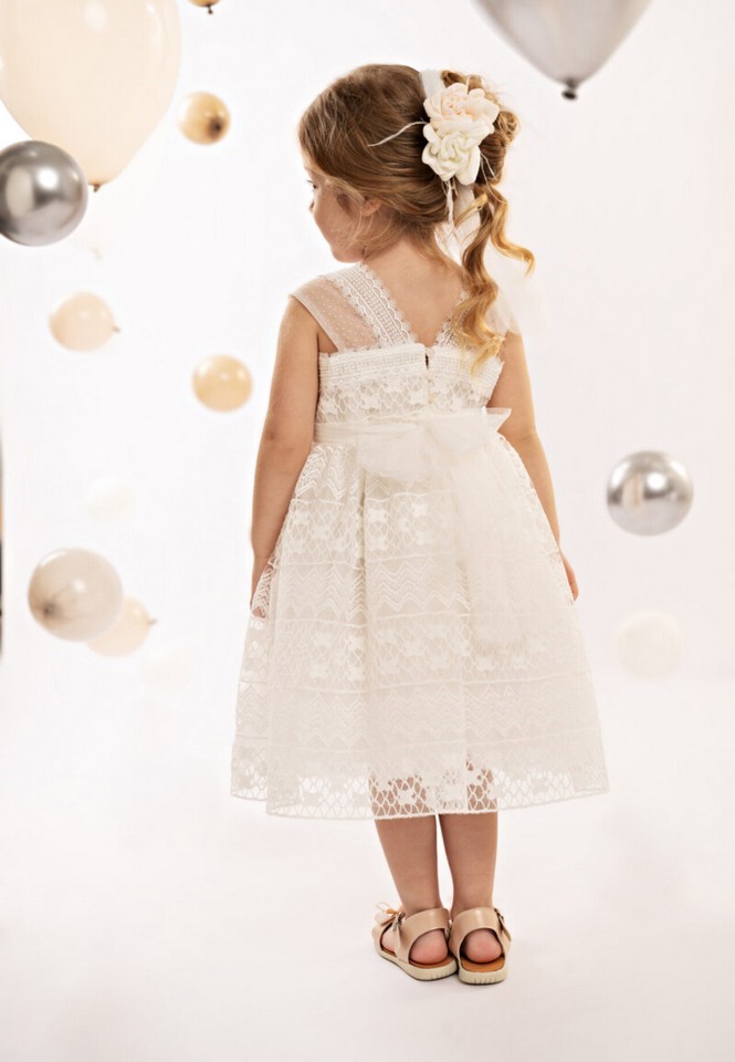 Ένα ονειρεμένο αμπίρ φόρεμα σε λευκό χρώμα, με μπούστο φτιαγμένο από δαντέλα και φαρδιές τιράντες από micro πουά τούλι. Η φούστα με πλούσιες σούρες από δαντέλα και glitter τούλι χαρίζει αέρινη κίνηση και λάμψη. Η ζώνη από τούλι, που δένει πίσω, στολίζεται υπέροχα με δύο χειροποίητα διακοσμητικά τριαντάφυλλα από σατέν σε ροζ και εκρού χρώμα, προσθέτοντας μια ρομαντική πινελιά τόσο στο φόρεμα όσο και στην ασορτί κορδέλα μαλλιών. Όλα τα φορέματα διαθέτουν βαμβακερή φόδρα και φουρό.