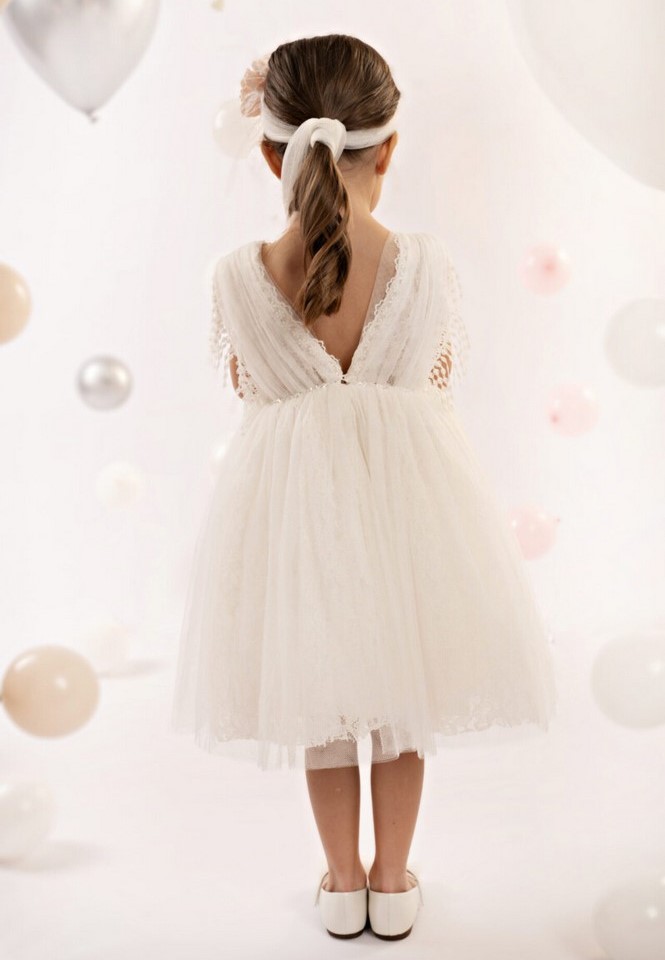 Ένα υπέροχο φόρεμα σε off white χρώμα, φτιαγμένο από μαλακό τούλι και δαντέλα που συνδυάζει την κομψότητα και την ρομαντική παιχνιδιάρικη διάθεση. Το κρουαζέ μπούστο από τούλι στολίζει μοναδικά η τρέσα με τα κρόσσια, ενώ η φούστα με τις πολλές στρώσεις από δαντέλα και τούλι, προσδίδουν όγκο και κίνηση στο φόρεμα. Δύο χειροποίητα τριαντάφυλλα σε ροζ και εκρού αποχρώσεις κοσμούν το μπούστο και την κορδέλα για τα μαλλιά, χαρίζοντας στο σύνολο μια αίσθηση φινέτσας και αρμονίας.
