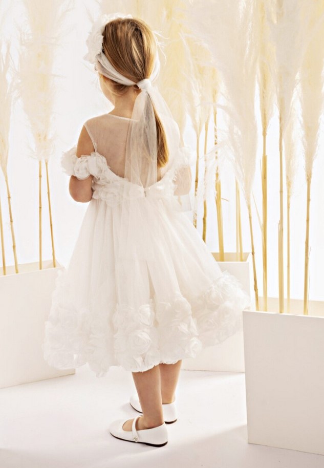 Αυτό το εντυπωσιακό φόρεμα σε off white χρώμα από κεντημένο με τρισδιάστατα απλικέ τριαντάφυλλα ύφασμα και απαλό τούλι, αποπνέει μία αίσθηση πολυτέλειας και μια αύρα ρομαντισμού. Το μπούστο, διακοσμημένο με το ίδιο λουλουδένιο μοτίβο, έχει ένα μανικάκι που αγκαλιάζει το μπράτσο ενώ η ανοιχτή V πλάτη από τούλι προσφέρει μία σαγηνευτική διάφανη λεπτομέρεια. Η πλούσια φούστα, κατασκευασμένη από μαλακό τούλι και τούλι με glitter, προσφέρει όγκο και κίνηση, ενώ η φάσα από το ύφασμα με τα τριαντάφυλλα ολοκληρώνει το τελείωμα με μία ρομαντική, μαγευτική αίσθηση. Η κορδέλα για τα μαλλιά, στολισμένη με τα ίδια λουλούδια από το φόρεμα και φτερά, προσθέτει την τελευταία, εκλεπτυσμένη πινελιά σε αυτό το υπέροχο σύνολο.