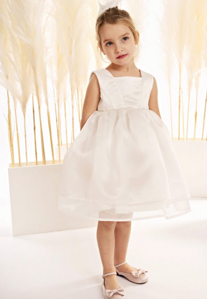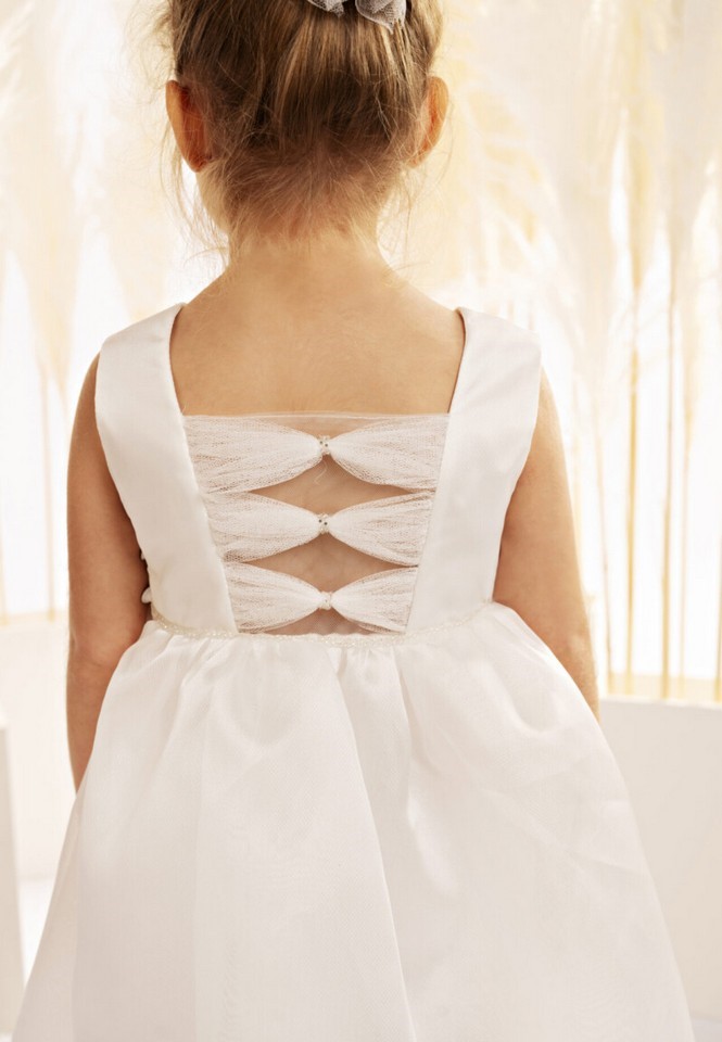 Αυτό το ξεχωριστό και ιδιαίτερο φόρεμα, φτιαγμένο από ντουσέζ ύφασμα και οργαντίνα σατινέ σε off white χρώμα, αποπνέει μία αίσθηση πολυτέλειας και μοναδικότητας. Το μπούστο, με κοψίματα που συνδυάζουν τις υφές των δύο υφασμάτων, έχει τετράγωνη λαιμόκοψη και φαρδιά τιράντα, προσφέροντας μία μοντέρνα και ταυτόχρονα κομψή γραμμή. Η πλάτη, ωστόσο, είναι η πραγματική έκπληξη αφού η διαφάνεια από τούλι «στολίζεται» με τούλινα φιογκάκια διακοσμημένα με στρας, δημιουργώντας ένα πραγματικά εντυπωσιακό αποτέλεσμα. Η πλούσια φούστα από οργαντίνα με πιέτες και δύο στρώσεις προσδίδουν κίνηση και όγκο ενώ στην μέση, μία σειρά από στρας δίνει λαμπερή αίσθηση. Η κορδέλα για τα μαλλιά, διακοσμημένη με χειροποίητο λουλούδι από οργαντίνα και φτερά, ολοκληρώνει την πριγκιπική εμφάνιση.