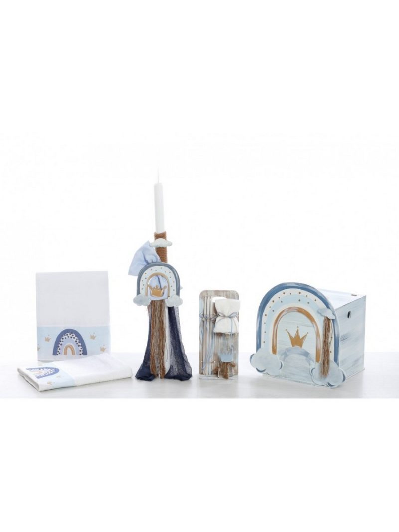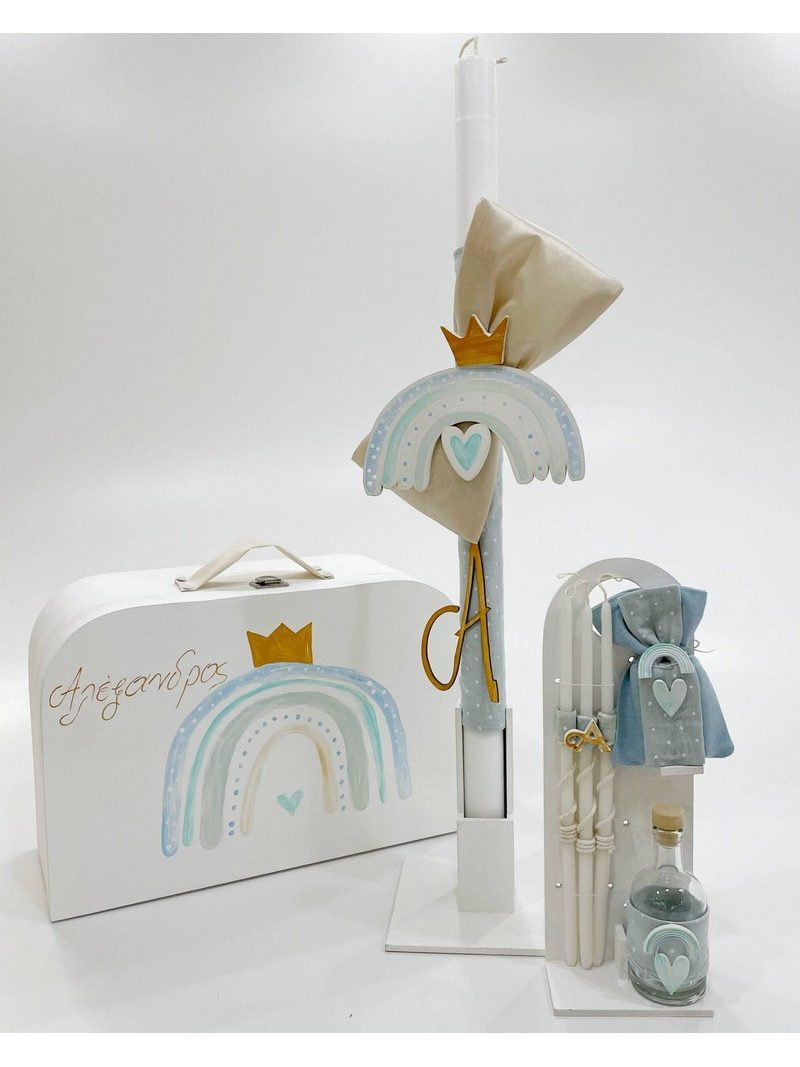 Το Βαπτιστικό σετ περιλαμβάνει (Λαμπάδα, Κουτί ή Βαλίτσα, τρία κεράκια, λαδοσετ με μπουκαλάκι για το λάδι και σαπουνάκι)